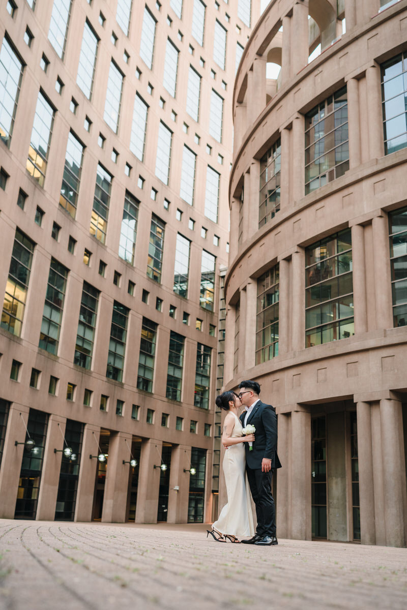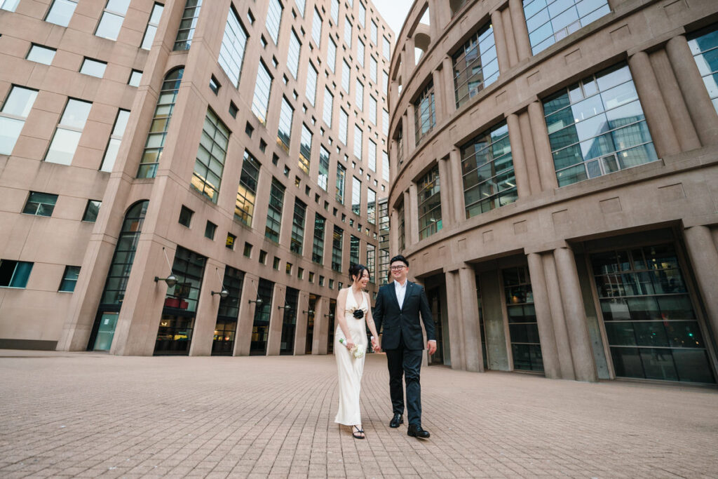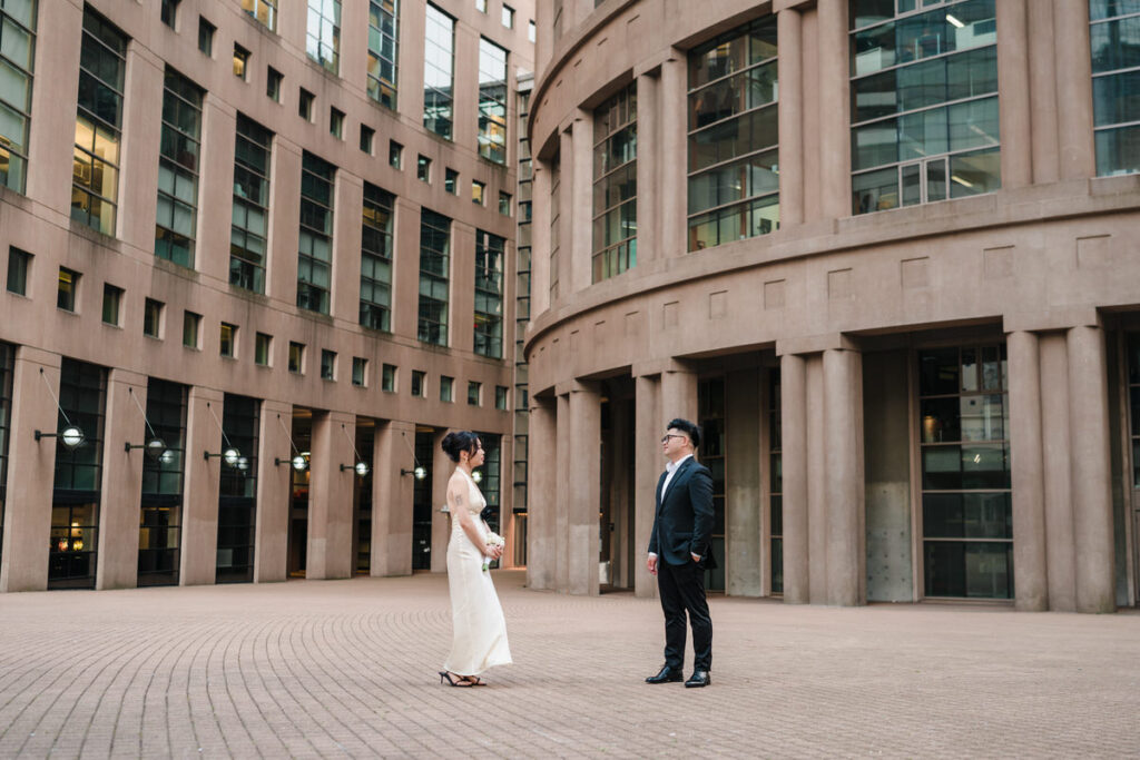 Yes, particularly if you want something that feels distinctly downtown and architecturally interesting. The curved colonnade and symmetrical pillars create a clean, elevated backdrop that doesn’t look like any other spot in Vancouver. It’s versatile in a way a lot of downtown locations aren’t. Covered areas for rain, a usable interior, and a rooftop garden most couples don’t know about until they’re there.