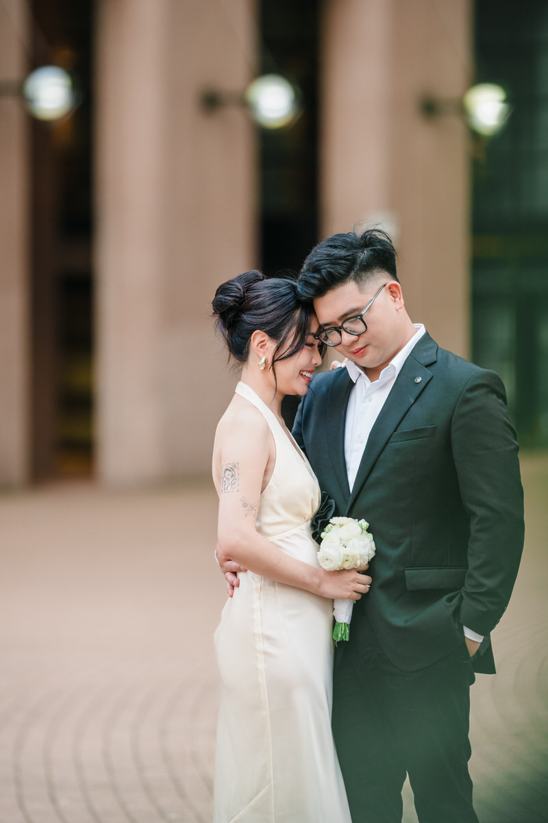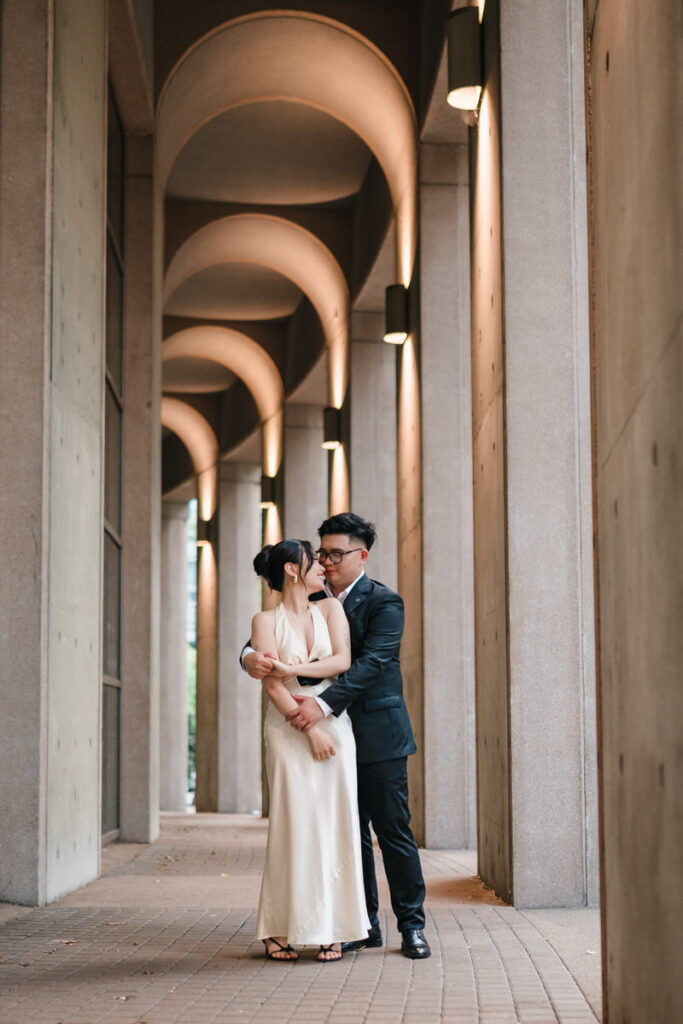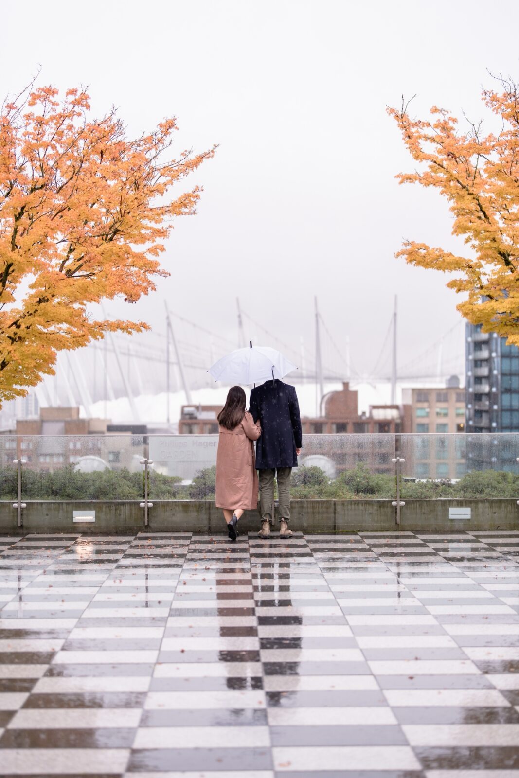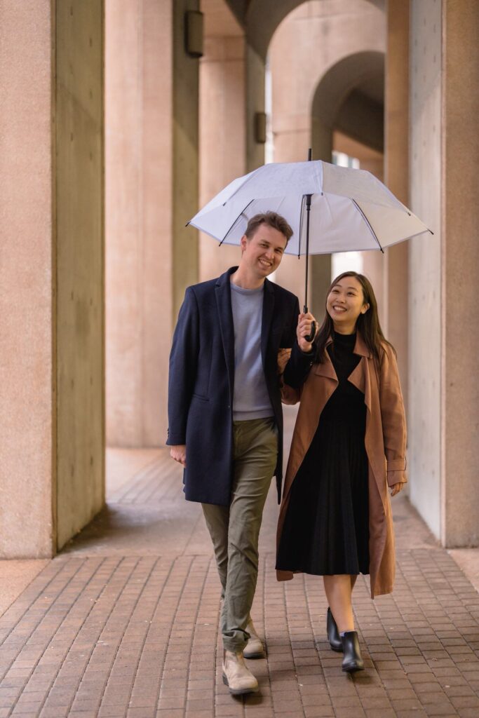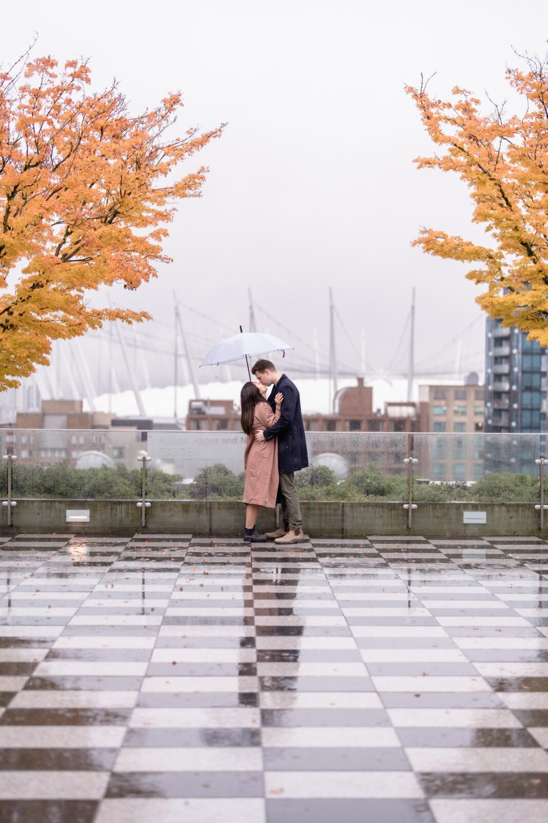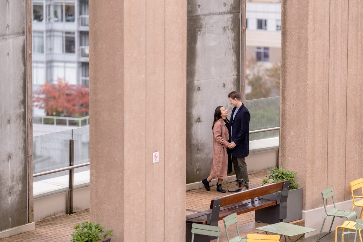 One of the things I always tell couples considering this spot is that it’s genuinely one of the better downtown Vancouver locations for a rainy day session. The reason is simple. The exterior colonnade is covered. You can shoot under those arched pillars and stay completely dry while still getting the full architectural backdrop behind you. A cute umbrella on the open plaza adds something to the photo rather than taking away from it.
