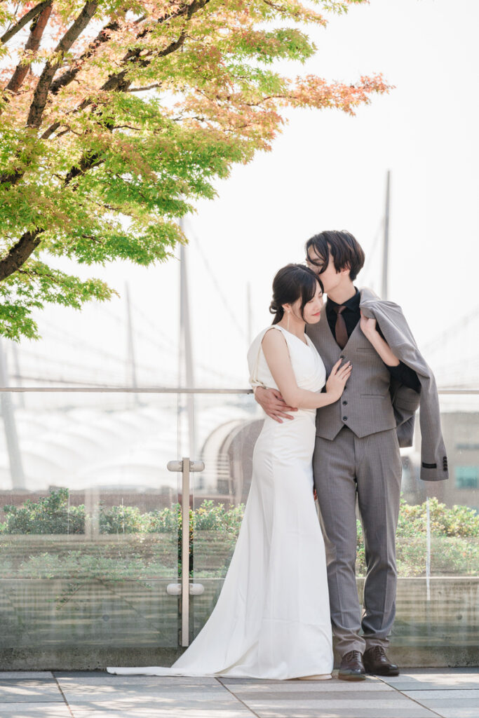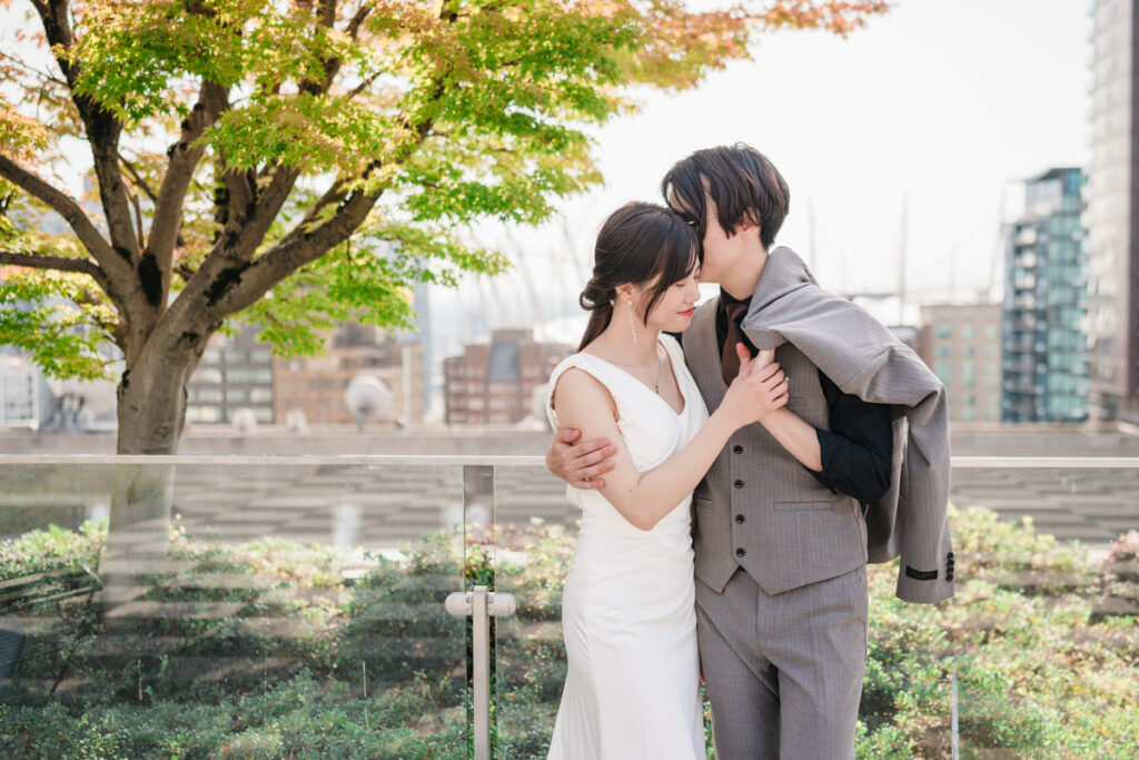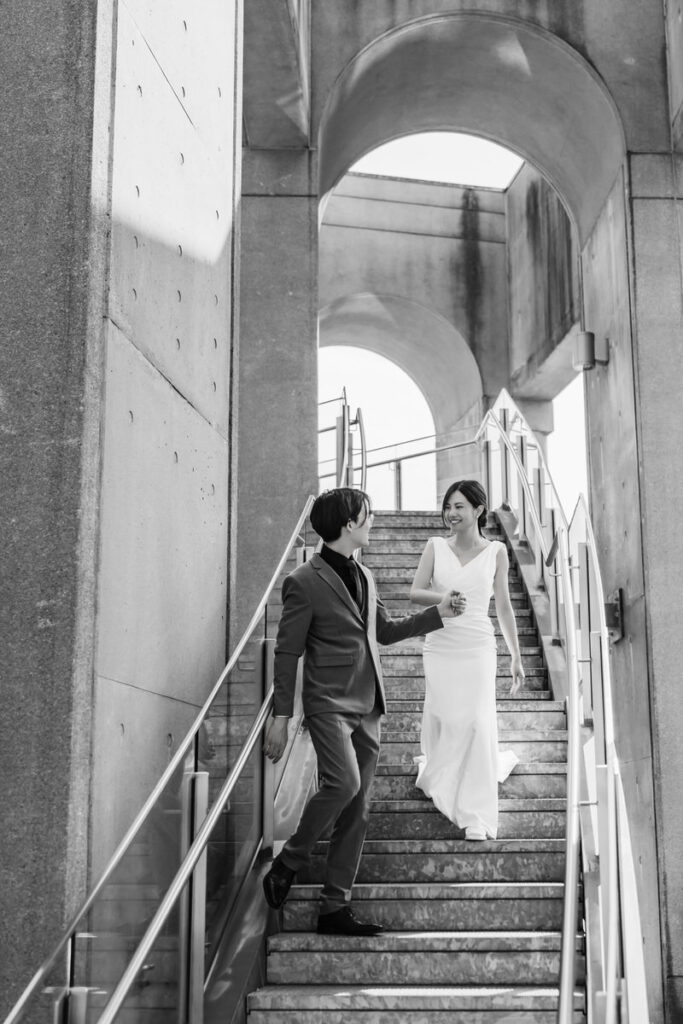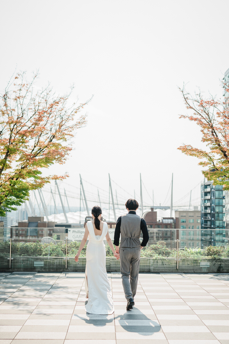 This is the version I get most excited about as a photographer. From 6:15pm on a Friday or Saturday evening, the library is yours. The L9 Rooftop Garden, the L8 Terraces, the Grand Staircase, and select interior spaces for photography. The building clears out and you have exclusive access for two hours, with the option to add a third. In late summer and fall, that evening window gives you the city skyline with the last of the day’s colour still in it. In October especially, the Japanese maples on the rooftop are at peak colour and the stadium is lit up in the background. I’ve made some of my favourite Vancouver wedding portraits in that exact spot.